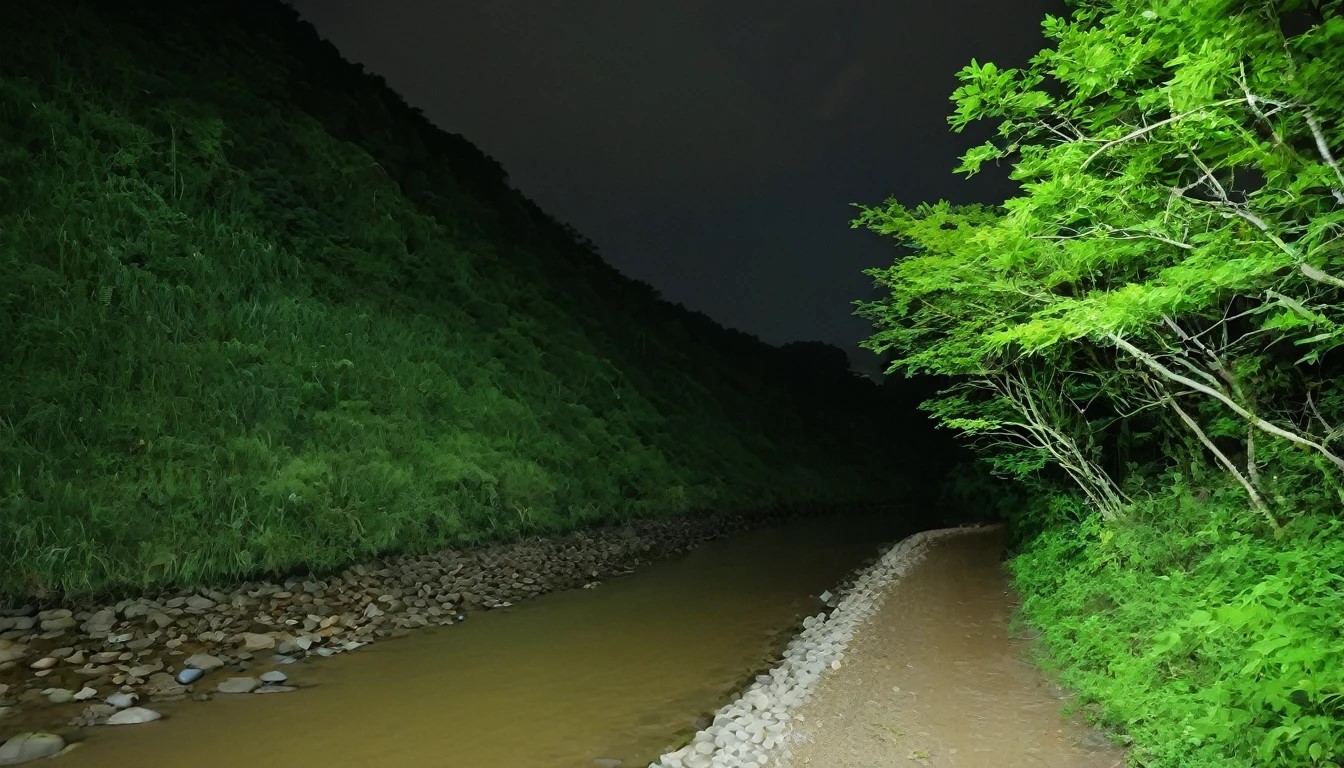 ふと、男は土手に足を止め、息を呑んだ。土手の斜面から、長い黒髪が這い上がってきたのだ。髪は濡れて重く、まるで生き物のように蠢いている。続いて、そこには白い手が現れた。指先は血まみれで、鋭い爪が伸びている。そしてゆっくりと、全身が姿を現す。