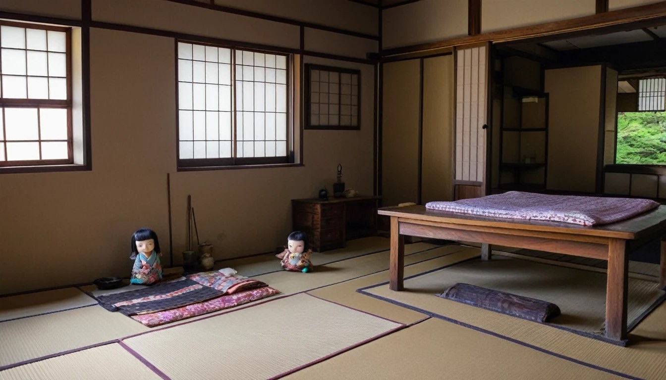 和室の古びた箪笥の上に古い人形が置かれていた。それは、時代を感じさせる布製の人形。黒い目玉は塗りつぶされ、不気味なまでに大きく裂けた口は、まるで何かを訴えているようにも見えた。何の気なしに人形を手に取ると、指先が冷たい感触に包まれた。しかし、その瞬間、背筋を凍らせるような寒気が全身を駆け巡り、何か恐ろしいことが起こるような予感が心をよぎった。