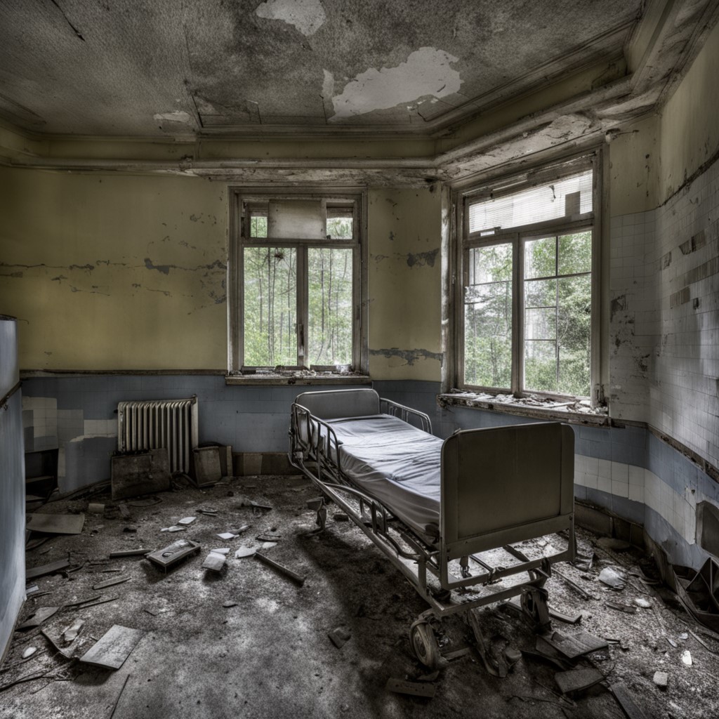建物の中に入ると、腐敗と埃の匂いが鼻を突いた。懐中電灯の光が廊下を照らすと、剥がれ落ちた壁紙と散乱した医療器具が目に入る。かつての繁栄を物語るように、至る所に放置された車椅子や点滴スタンドが影を落としていた。