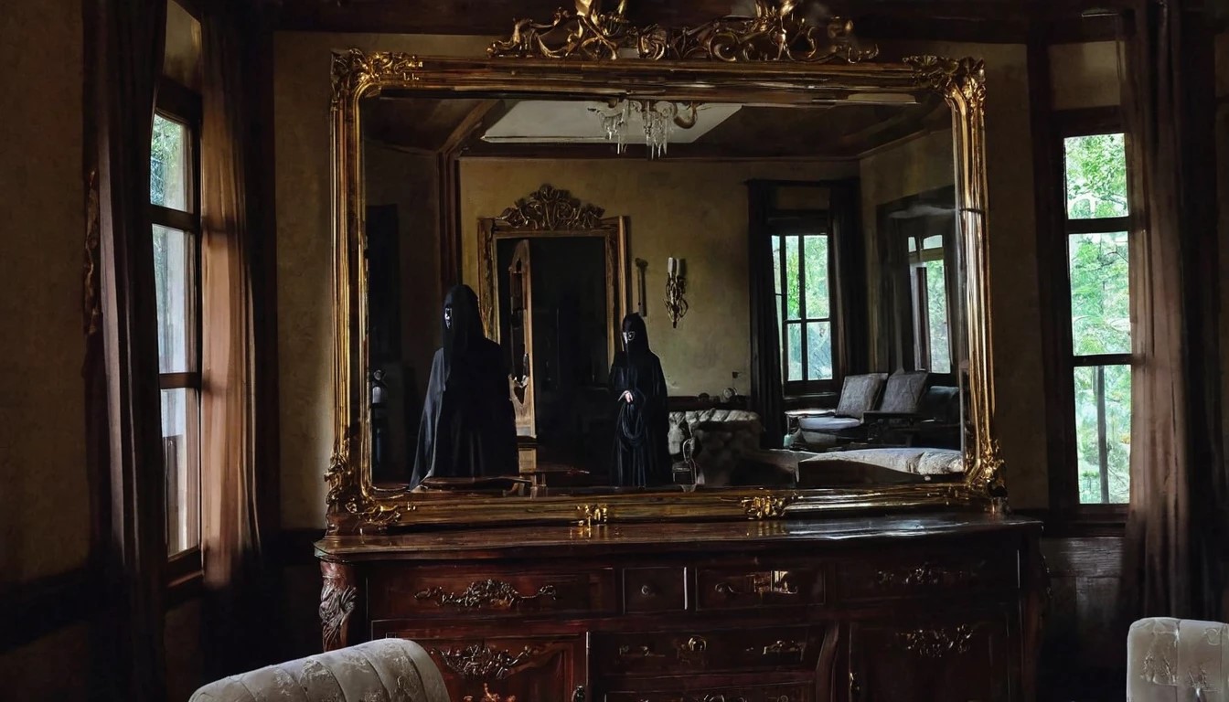 そして、真夜中を告げる鐘の音と共に、鏡の中の自分の顔が揺らぎ始めた。亜矢は息を呑んだ。鏡に映る顔が徐々に変化し、先ほど見たアルバムの女性の顔へと変わっていく。亜矢の心臓が高鳴る。恐怖と興奮が入り混じる中、彼女は囁くように話しかけた。